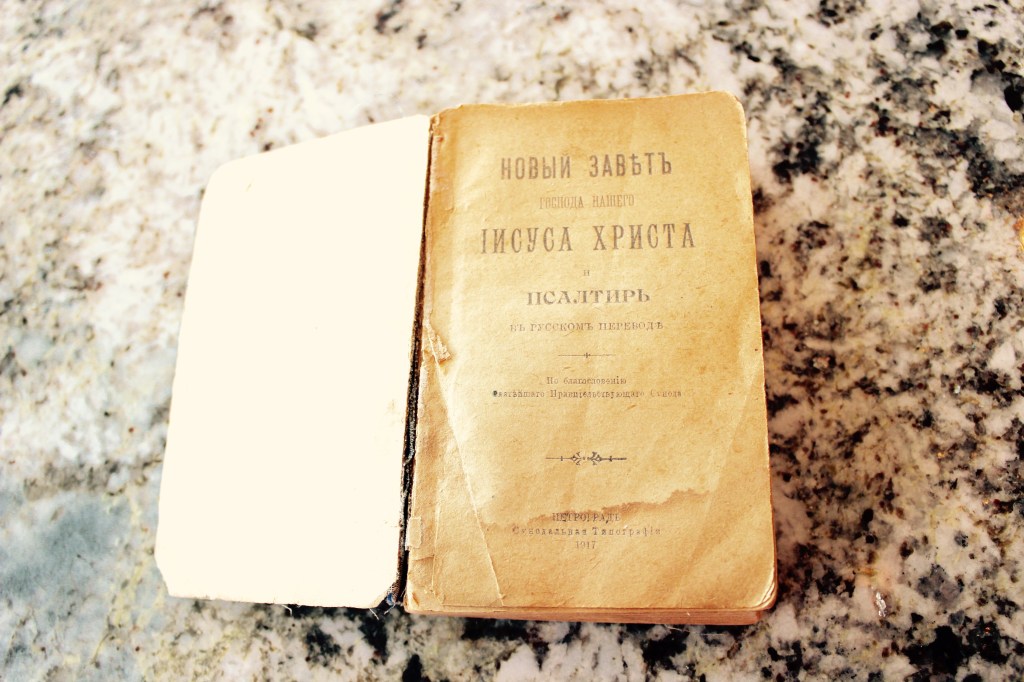 “I was walking up the beach, saw where they had thrown a uniform away, and recognized that it was his. His things were just scattered there on the beach where they killed him and buried him in a shallow grave.” Arnold picked up parts of the uniform to take home—a Russian dagger, Cossack hat, and other pieces with military ranking. Also among those effects was a small, blue clothbound New Testament in Russian, printed in 1917 just prior to the Russian Revolution and the country’s conversion to communism.