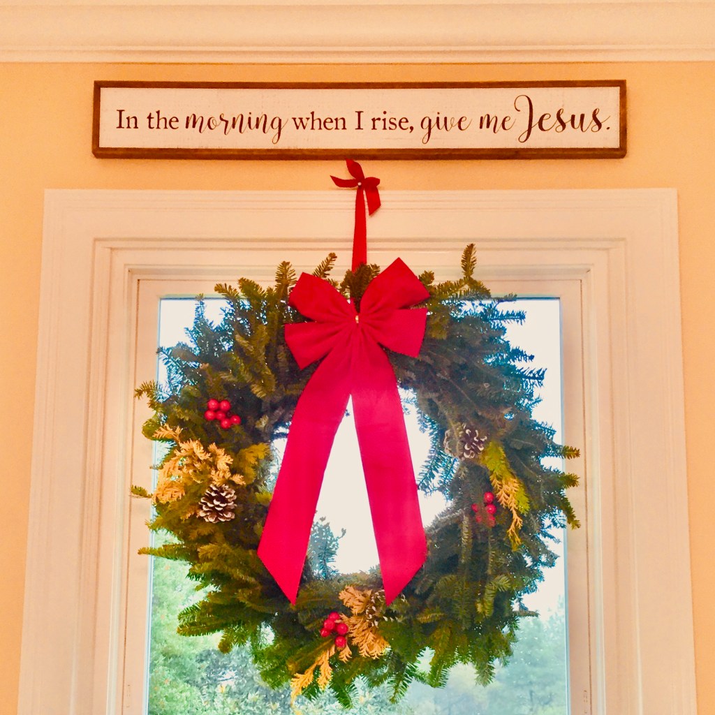 When friends gave us a beautiful evergreen wreath a couple of weeks ago, we were a bit puzzled about where to display it. We had no good options for placing it outdoors. But then, we settled on the perfect spot—on the window next to our kitchen table. What a privilege each day to have the “real thing” scenting our kitchen!