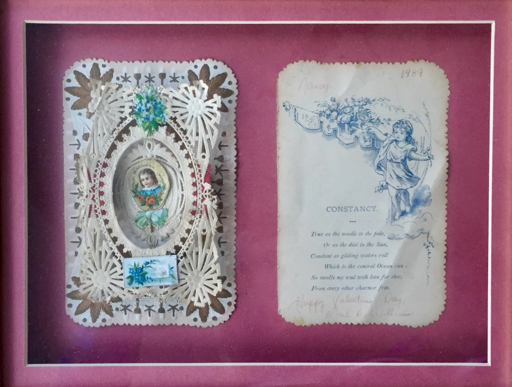 On the first Valentine’s Day with my sweetheart, Mark, he surprised me with a gift delivered to my office—a potted hyacinth and an antique Valentine. Now slightly tattered, this lacy card (in the photo above) is framed and preserved in a shadow box on our wall, its message still dear to my heart: