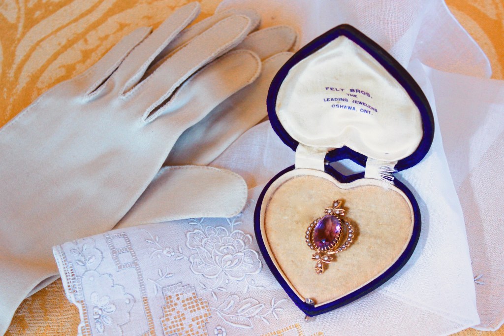 Awhile back, we closed a bank deposit box. Not much was in it, nothing of any enormous value. We tossed the items in a grocery bag and brought them home. Among them was a purple heart-shaped box, about the size of a cookie. Its velour finish was almost worn off, but inside its still-soft velvet and satin interior was a Victorian brooch made of amethyst, seed pearls, and gold.