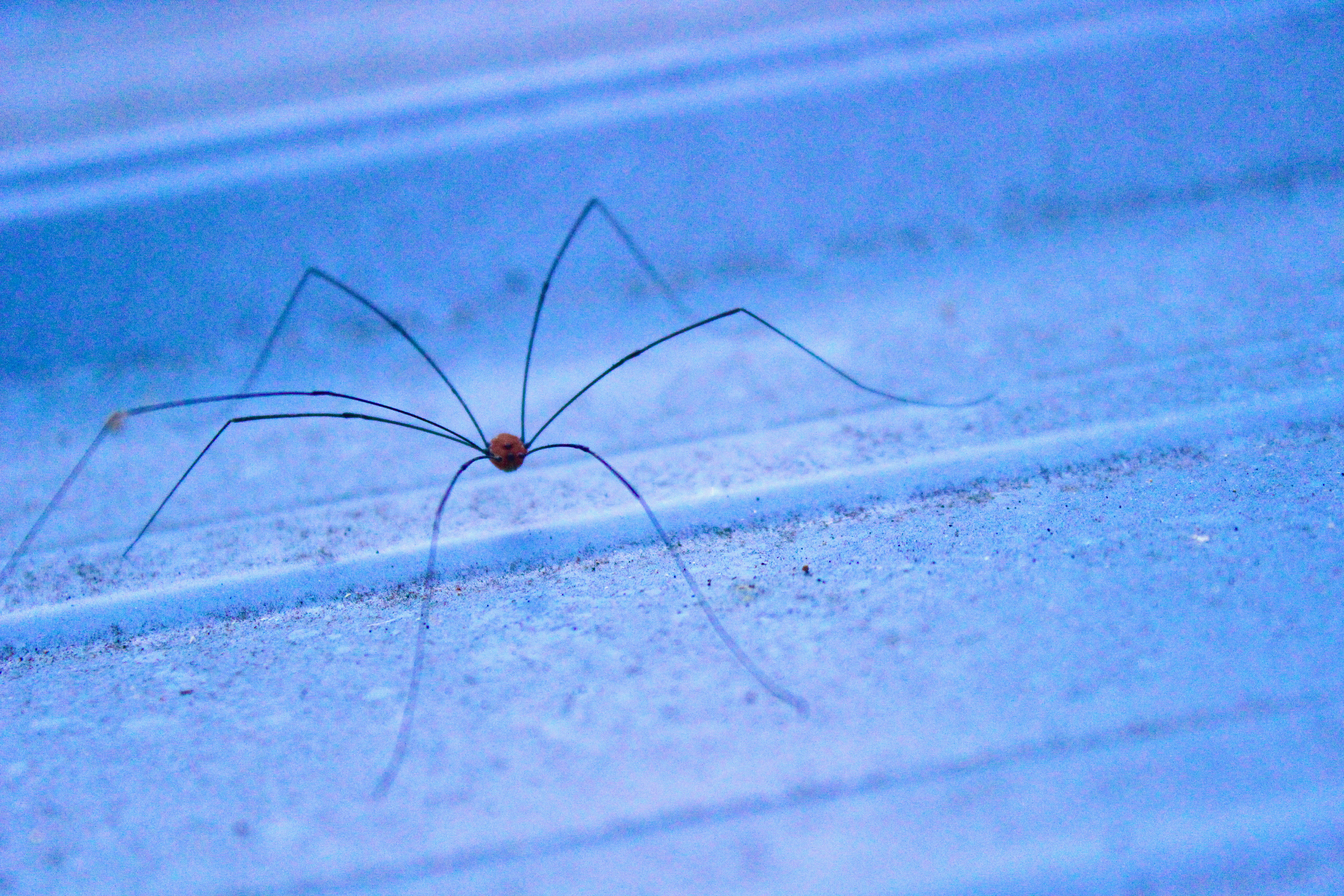 We seem to have quite a few spiders making their home with us, mostly confined to our basement (commonly known as “cellar spiders”). Another kind of “daddy longlegs” critters known as “harvestmen” are active right now, too, although they’re not really spiders—they belong to a different quadrant of the arachnid kingdom known as opiliones. I remember my grandmother’s house had scores of them in leggy clusters around the eaves, making the roofline look as if it had frizzy hair underneath.