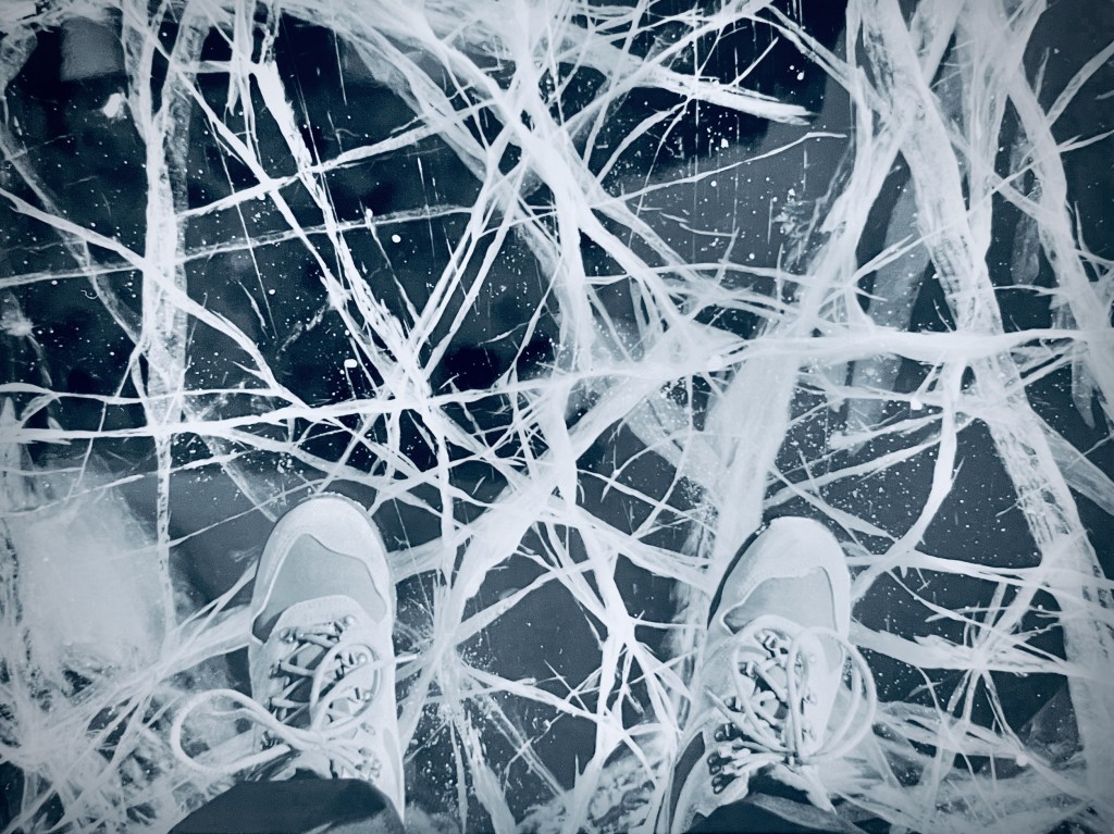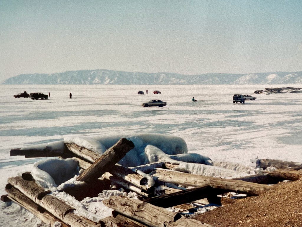 My husband and I visited Lake Baikal more than two decades ago, during the last week of March. Its icy surface appeared impenetrable. Silvery streaks, like jet trails across a deep blue sky, criss-crossed the upper portion while the depths descended into clouds and darkness.