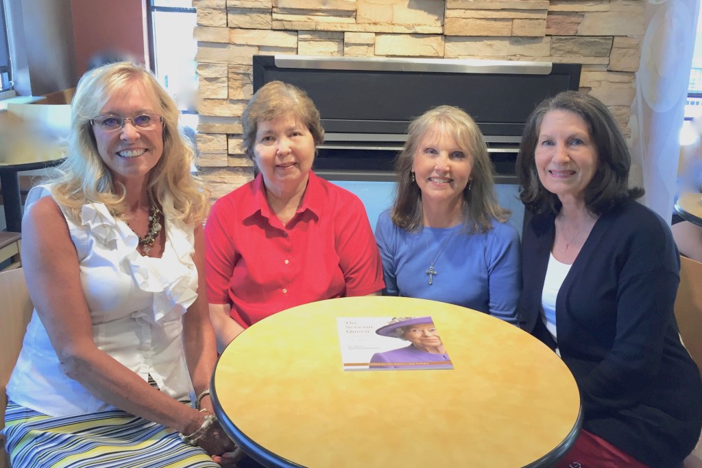 My sweet book-reading friends–Michele, Willette, (me), and Linda. We sent this photo to the Queen….