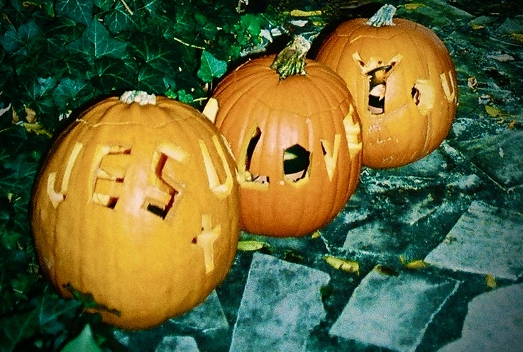 When my children were young, pumpkin-carving was a fun activity—nine year, we wrote “JESUS-LOVES-YOU” on three pumpkins and got lots of good comments from trick-or-treaters.