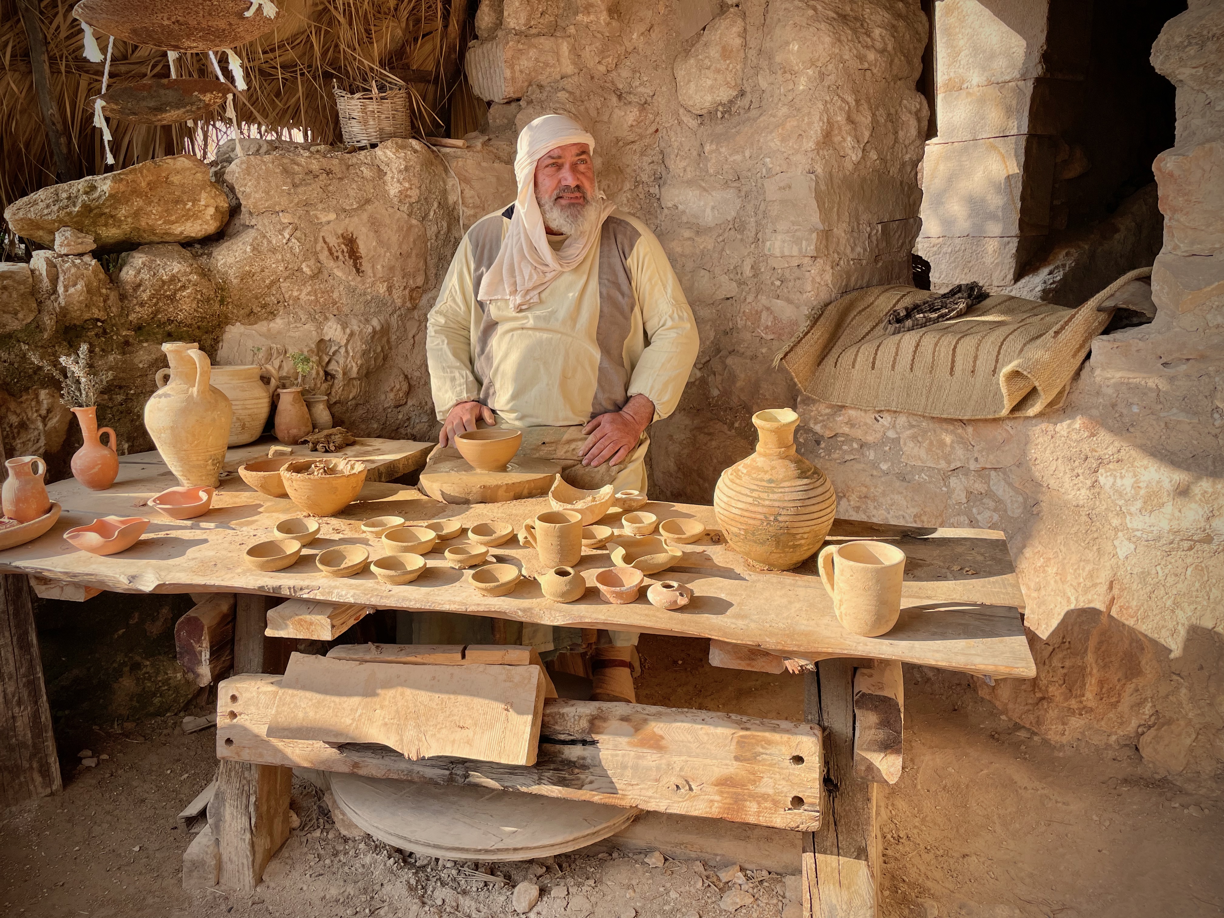 In Nazareth Village in Israel, a re-enactor displays his handiwork at the potter’s wheel.