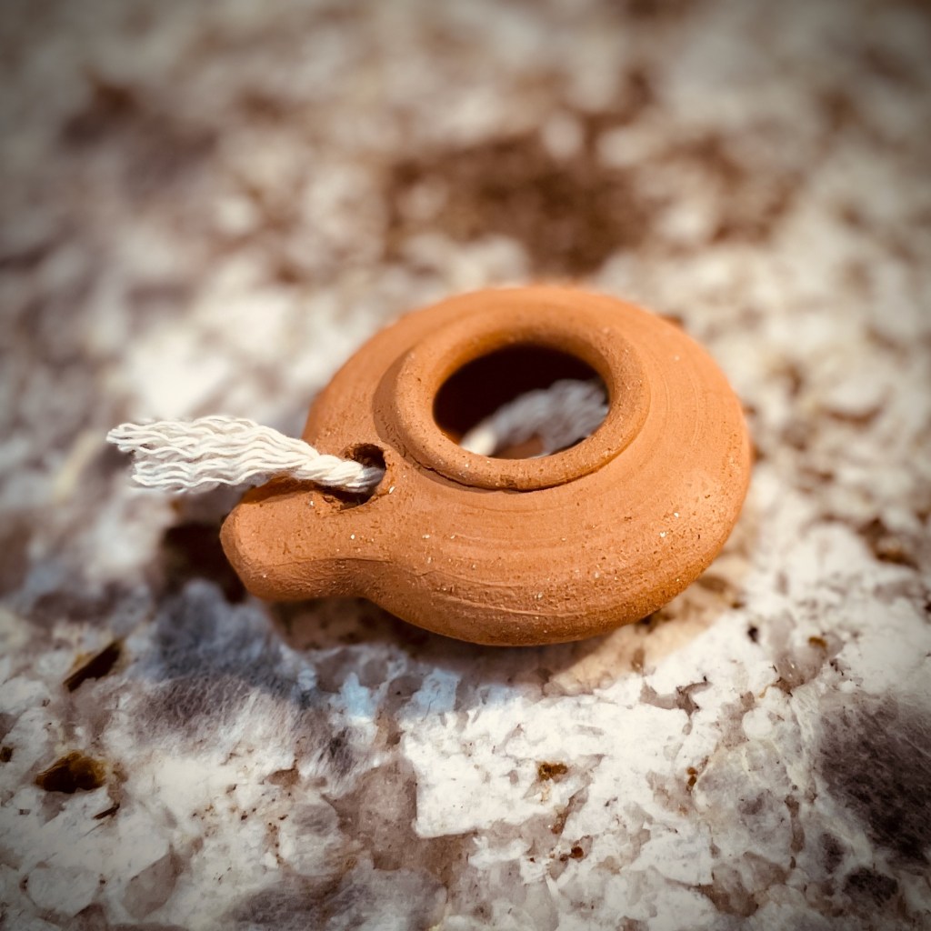 A hand-thrown oil lamp with wick, purchased from among the potter’s wares at Nazareth Village