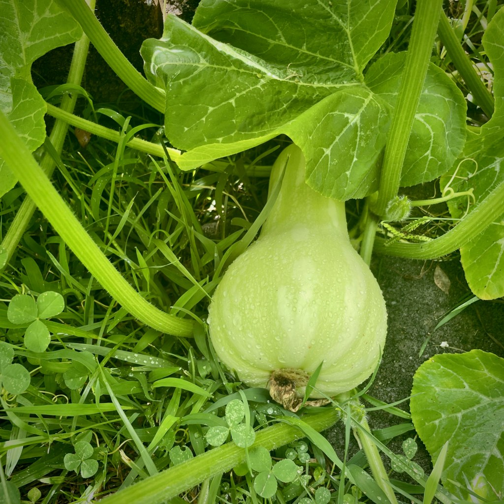 Fast forward six weeks later—we now have curling vines and leaves that carpet more than 200 square feet of our backyard grass. They spill out and slither around the garden, shoving aside the greens and herbs. Hidden underneath the square-foot-sized leaves are at least a dozen fledgling squashes, giving us prospects for soup* and oven-roasted butternut bites in our future. Let’s call them UFO’s…Unidentified Frying Objects.