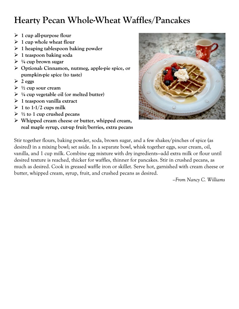 Fall is the perfect time to flex our artistic muscles. Most of us are past the flurry of summer vacation trips, back-to-school efforts, and even lawn-mowing. It’s time now to start canning that bumper crop of apples, cooking pecan waffles (recipe below), whipping up a spice latte, pulling out the embroidery projects, carving pumpkins, or stacking up logs for winter. Cooler temperatures energize you to get out your camera, compose poetry, dance around a campfire, or paint an old barn.